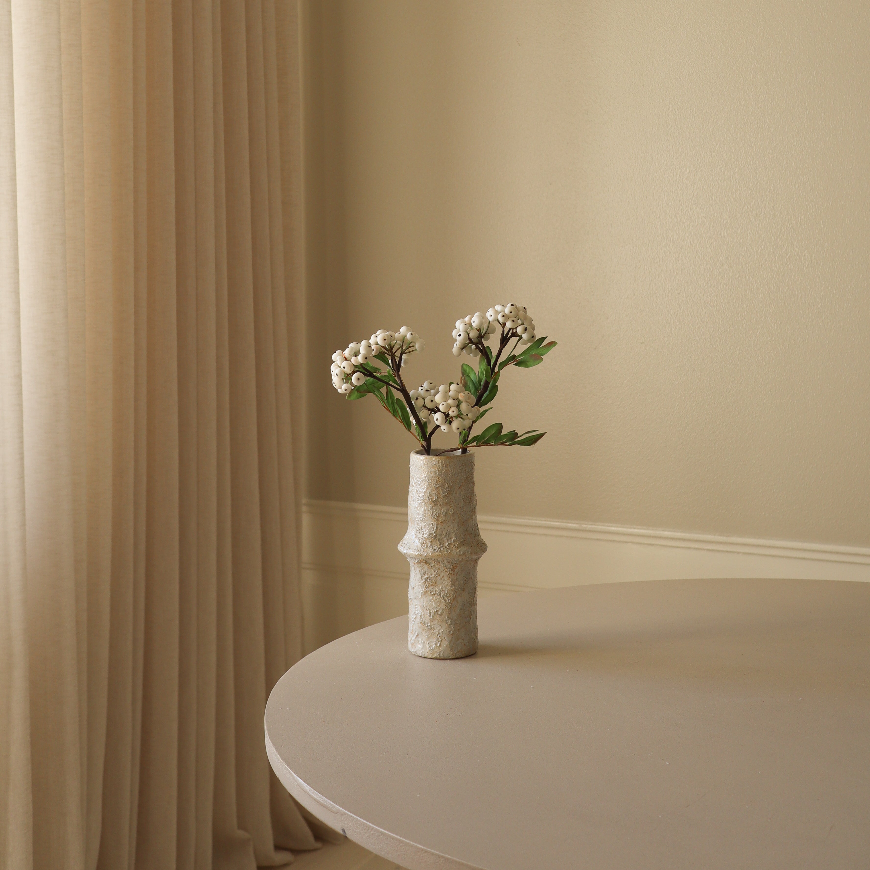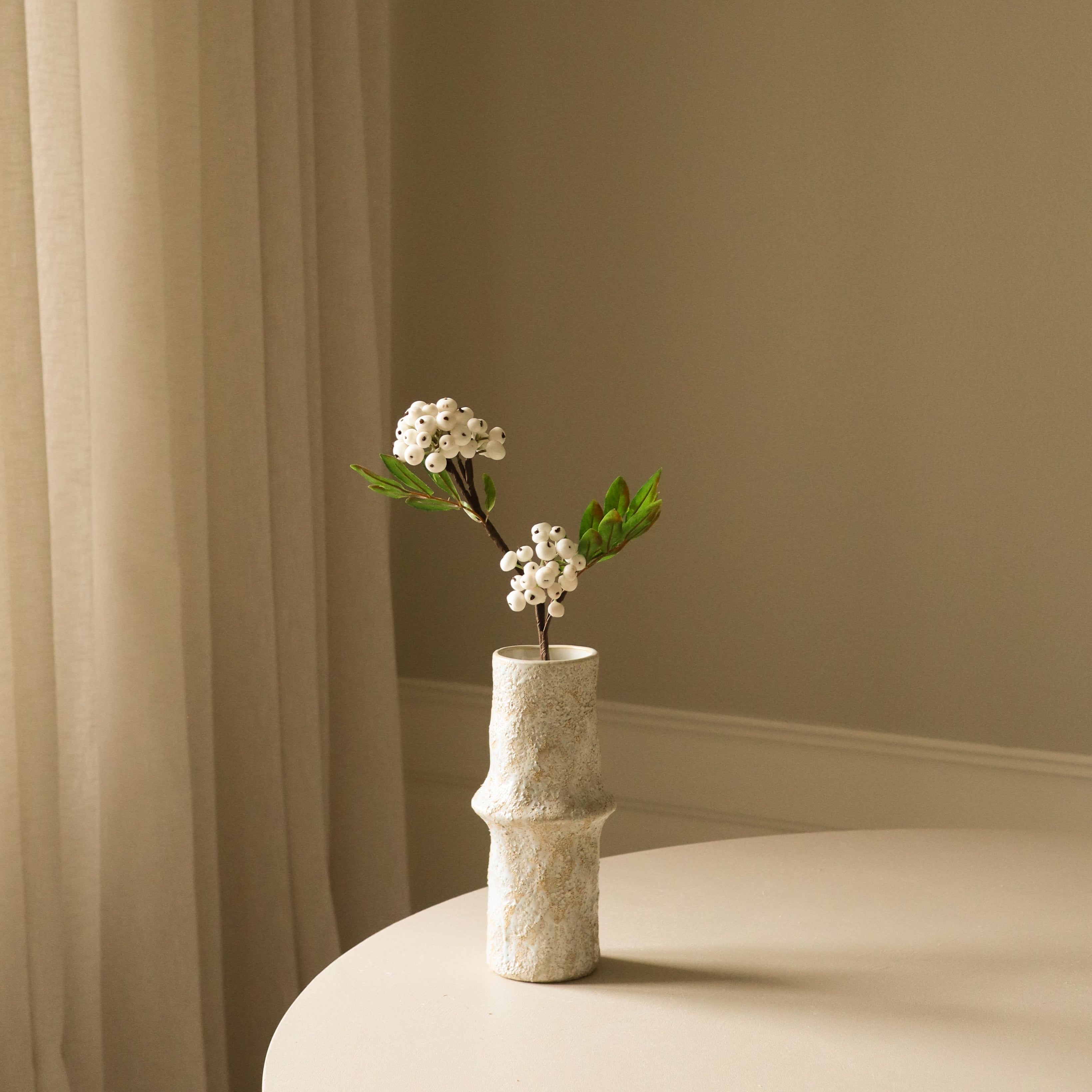 The Small Ceramic Earth Vase featured in the image measures 24,5 cm in height and 8 cm in diameter.