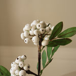 This White Small Snowberry Branch features clusters of round, matte white berries arranged along its dark brown stem. The berries are interspersed with elliptical green leaves that have a slightly glossy surface and natural veining. The slender branch structure provides an airy composition, making it an ideal accent for arrangements. The stem measures 40 cm in height and can be adjusted as needed.
