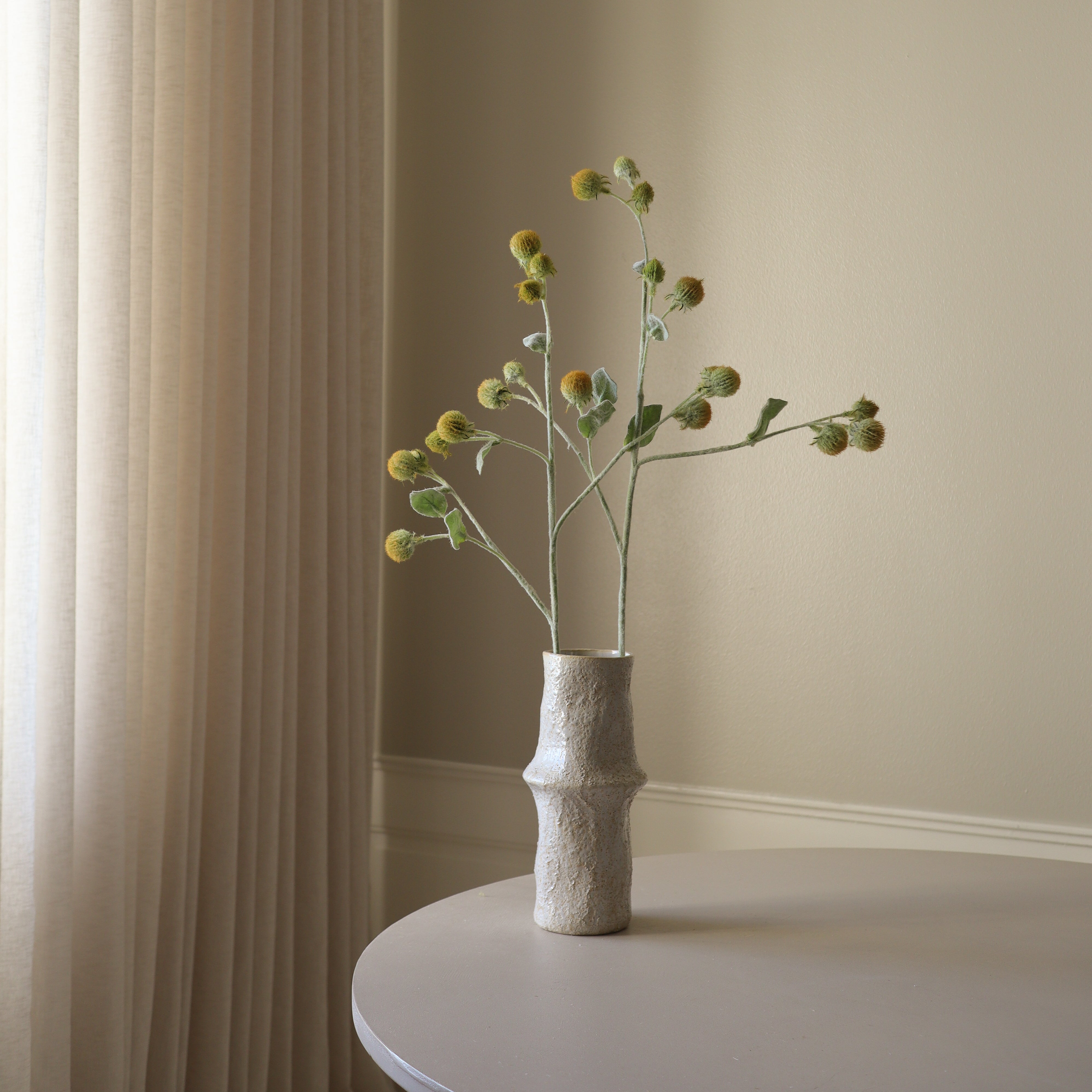 This Yellow Globe Thistle Flower features multiple rounded blooms with a spiky, fine-haired texture in muted yellow-green hues. The blossoms are supported by slender, slightly curved stems covered in soft, velvety green leaves. The branching structure extends outward, giving a natural, organic form. The stem reaches a height of 87 cm and can be adjusted as needed.